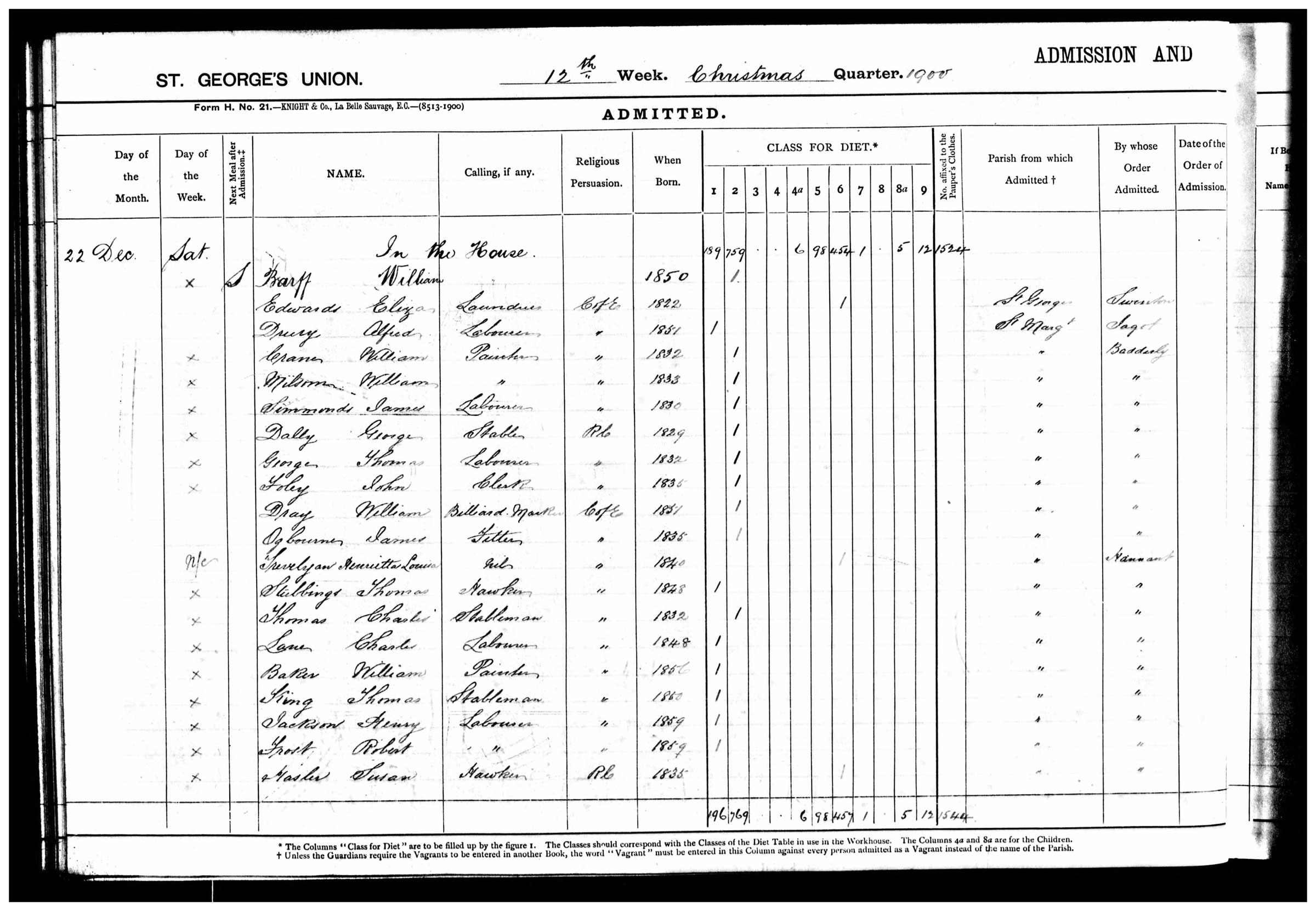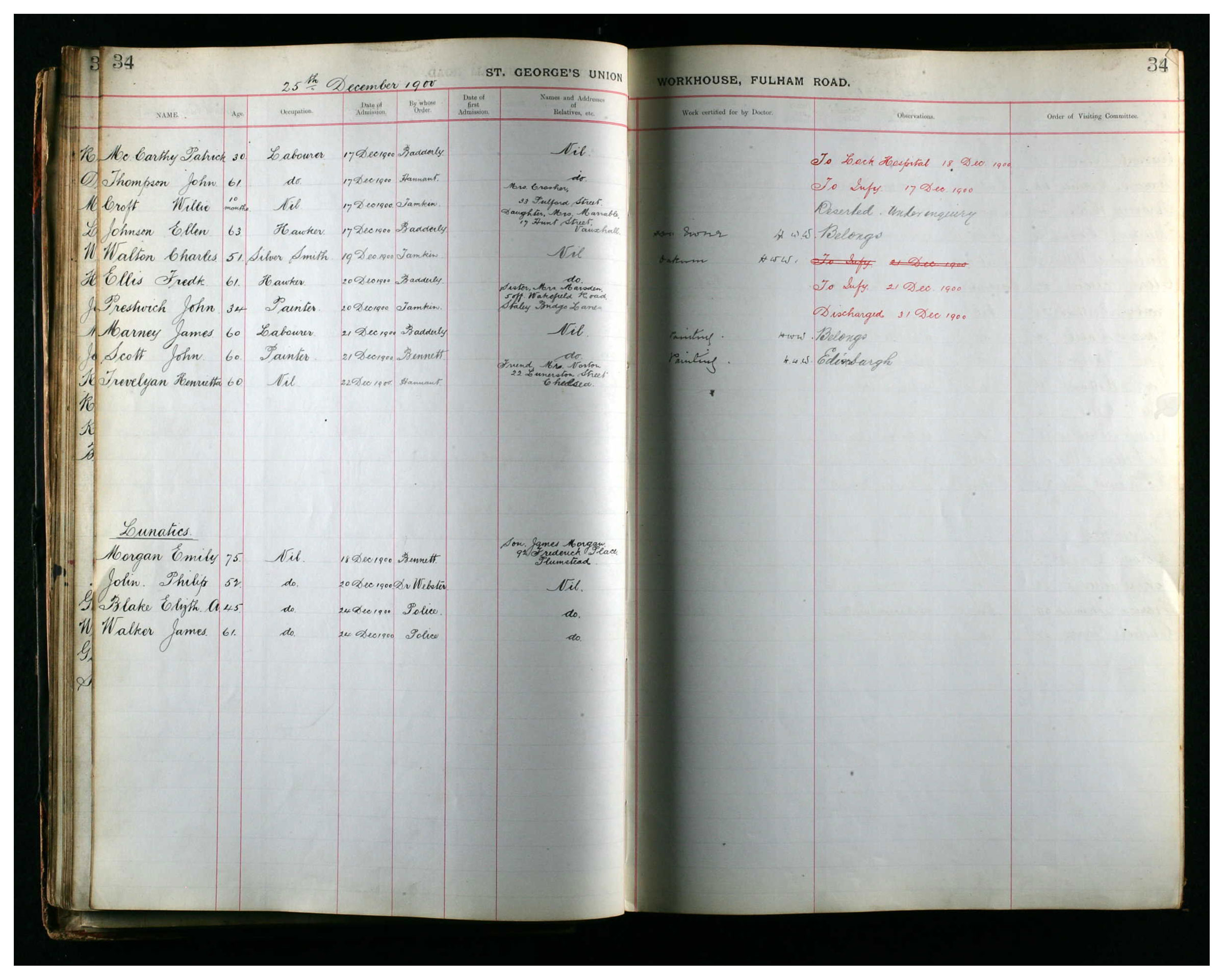 In late December 1900 (shortly after her estranged husband's death in California), Henrietta Trevelyan was admitted to Fulham Road Workhouse. (See also Ste George's Poor Law Union.)