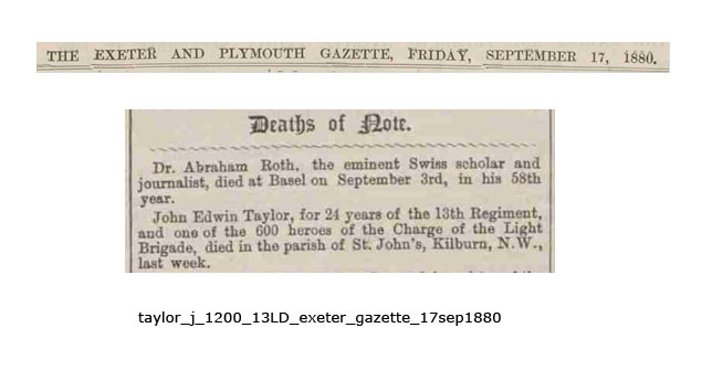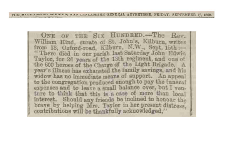 "There did in our parish last Saturday John Edwin Taylor, for 24 years of the 13th regiment, and one of the 600 heroes of the Charge of the Light Brigade. A year's illness has exhausted the family savings, and his widow has no immediate means of support.