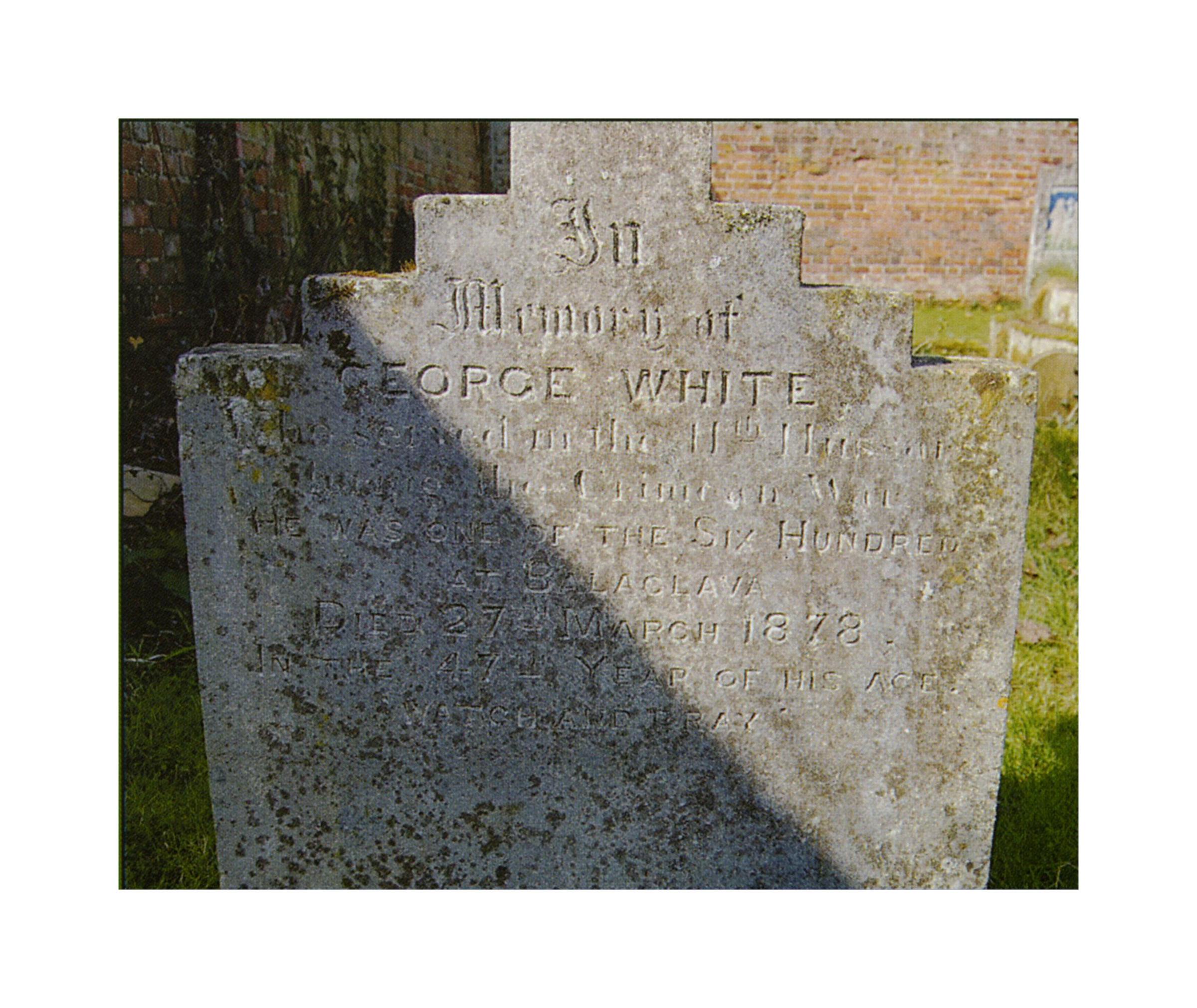 Prior to the discovery of this tombstone by Mike Hinton, all that was known of Private White's life after the war was that he was a member of the 1877 Balaclava Commemoration Society, but not the all-important 1879 group which vetted all members as Chargers. The inscription on his headstone proclaims that he was "One of the Six Hundred at Balaclava" and further notes that he died on 27 March 1878, at the age of 47. While tombstone inscriptions are not always reliable concerning facts stated thereon, the fact that White died in 1878 provides a very good reason for his absence from the list of the 1879 Balaclava Commemoration Society [Ed].