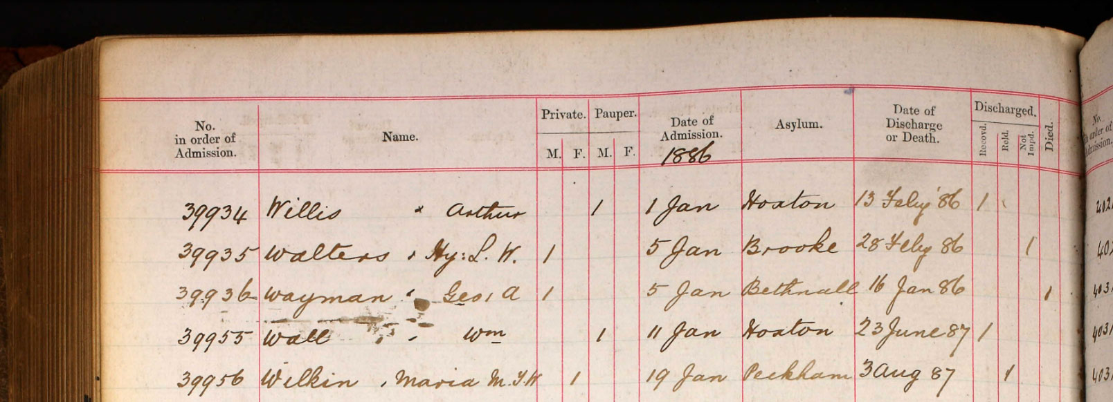 ???? 22 Apr 1884 to 19 January 1886 to 3 August 1887 - Peckham - private patient, discharged: released