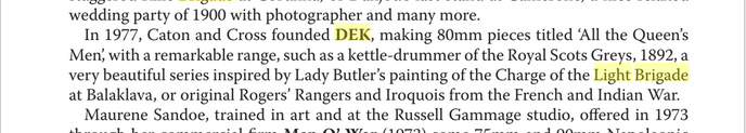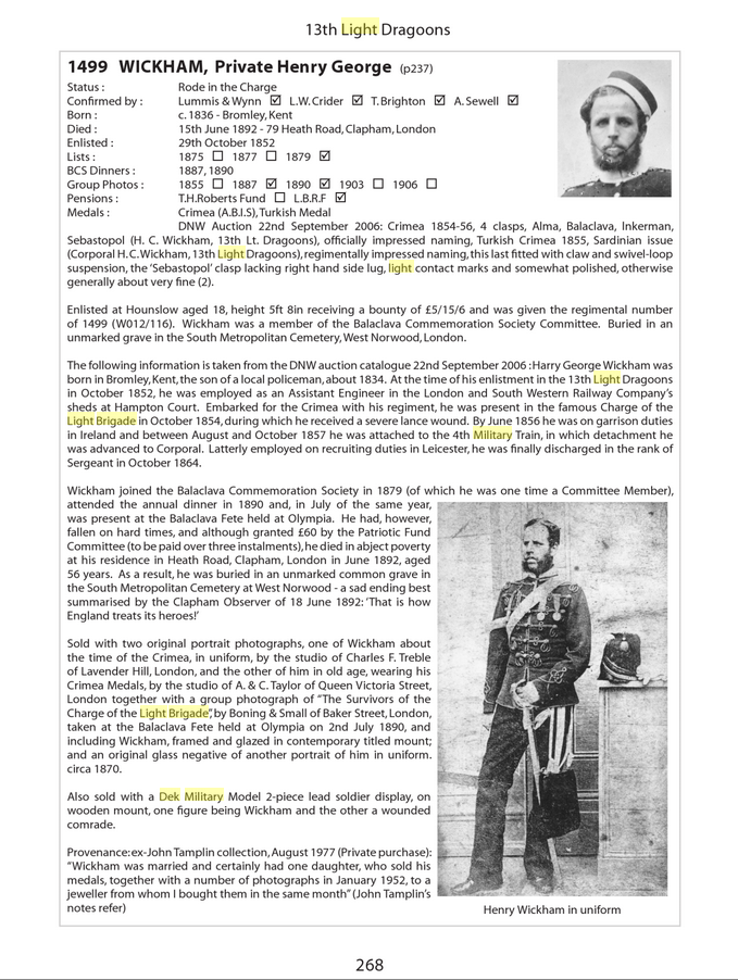 Wickham was present at the battles of Alma, Balaklava, Inkermann and Sebastopol, and is confirmed in all the rolls as having ridden in The Charge of the Light Brigade. He received a severe lance wound during the Charge, but managed to help a wounded comrade in the 17th Lancers back to the British lines. This incident is depicted in Lady Butler's famous painting 'The Return', Dek Military Models producing a vignette of lead soldiers based on Lady Butler's composition.