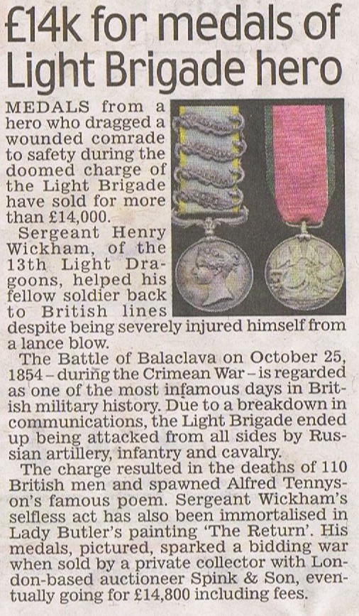 "Death of a Balaclava Hero - On Wednesday last there died at No. 81 [sic] Heath Road, Clapham, Sergeant George Wickham, who was attached to the 13th Light Dragoons at the time of the Crimean campaign in 1854. He was one of the famous Light Brigade men, and lived to be 57 years of age.