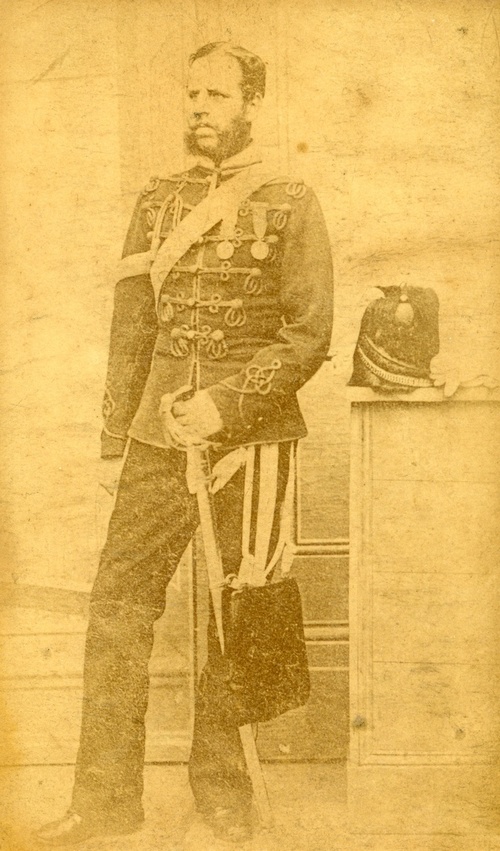 See copies of photographs of him - one in uniform as a young man, and the other in later life - in the 13th Hussars file.