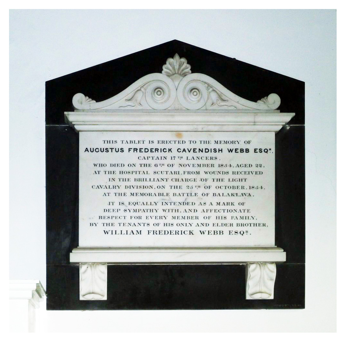 "This tablet is erected to the memory of Augustus Frederick Cavendish Webb, Esq., Captain, 17th Lancers, who died on the 6th of November 1854, aged 22, at the hospital at Scutari from wounds received at the brilliant charge of the light cavalry division on the 25th of October 1854 at the memorable battle of Balaclava.