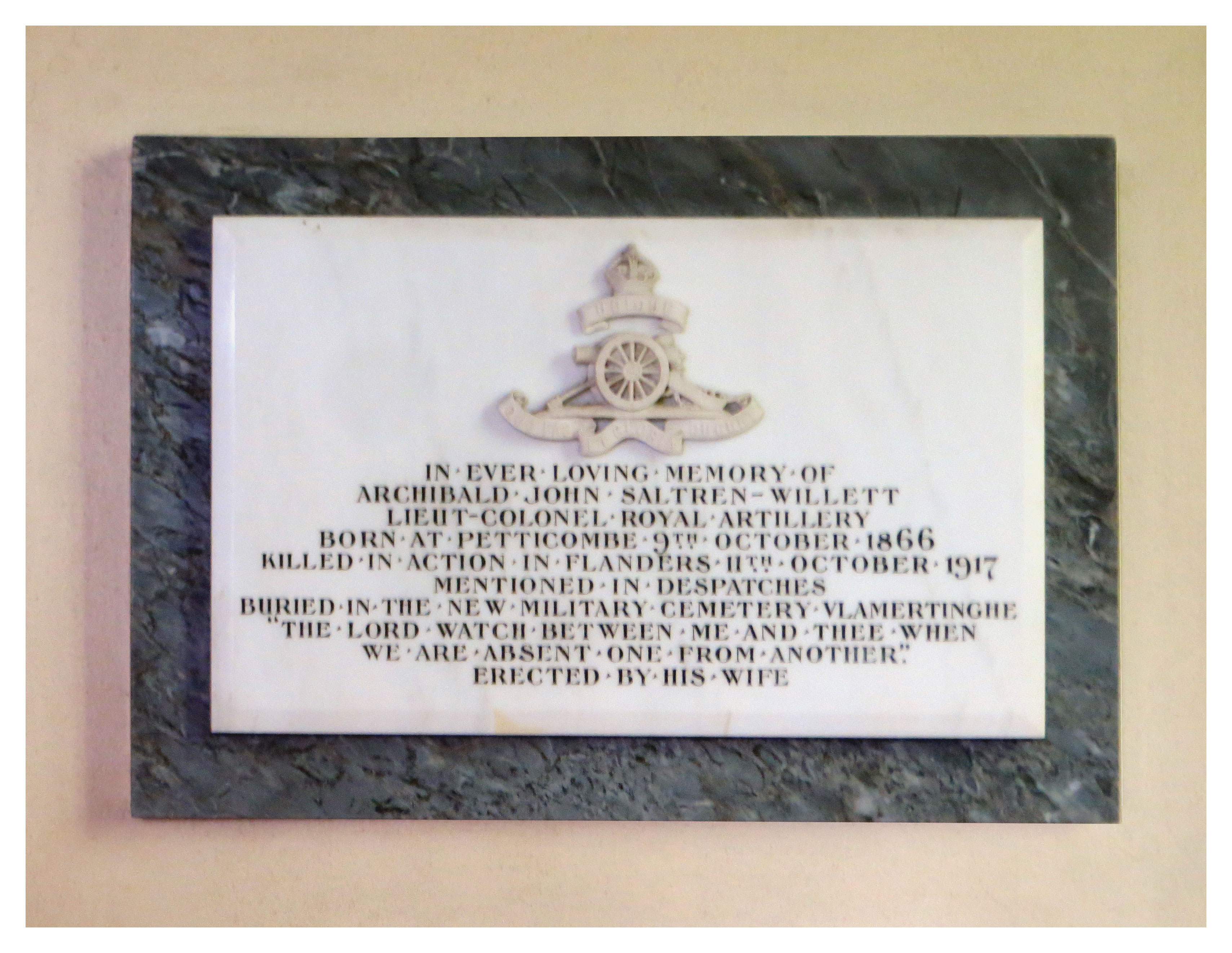 [PB: Note also the memorial to Lieut-Colonel Archibald Saltren-Willett, also of the Royal Artillery, below. He too was from Petticombe. A nephew?]