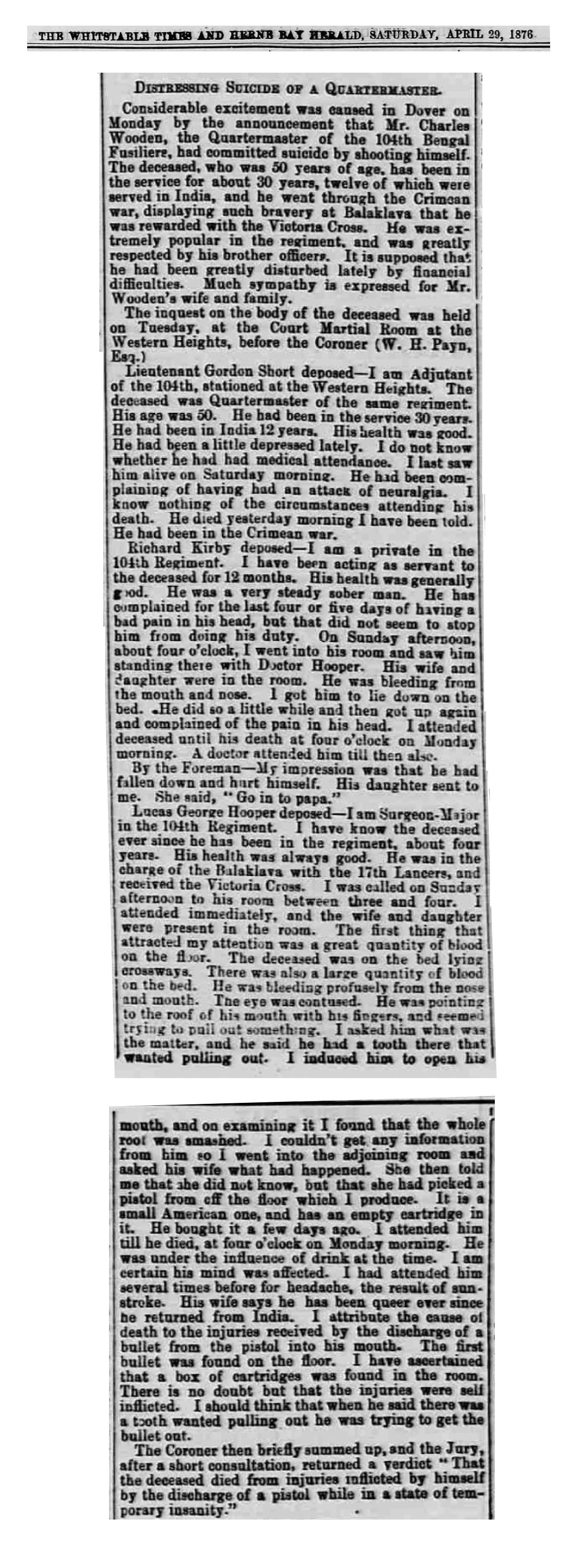 On Tuesday an inquest was held at the Court Martial-room at the Western Heights, before the Coroner (W. H. Payne, Esq.), on the body of Mr. Charles Wooden, the Quartermaster of the 104th Bengal Fusiliers, who committed suicide by shooting himself. The deceased who was 50 years of age [PB: sic? His dob suggests only 40], had been in the service for about 30 years, twelve of which were served in India, and he went through the Crimean war, displaying such bravery at Balaklava that he was rewarded with the Victoria Cross.