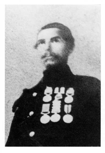 (See records of 828 William Robinson, and 855 John Moore, who were both awarded this combination of medals and were serving at the time the original photograph was said to have been taken. Another is an N.C.O (with the badge of rank of a Rough Rider Sergeant above his stripes) and with the (what appears to be a three clasp Crimean medal when viewed in comparison with others known to be four clasp) and Turkish medals, who could be any one of a number, no indication being in the musters as to who held this post at the time.