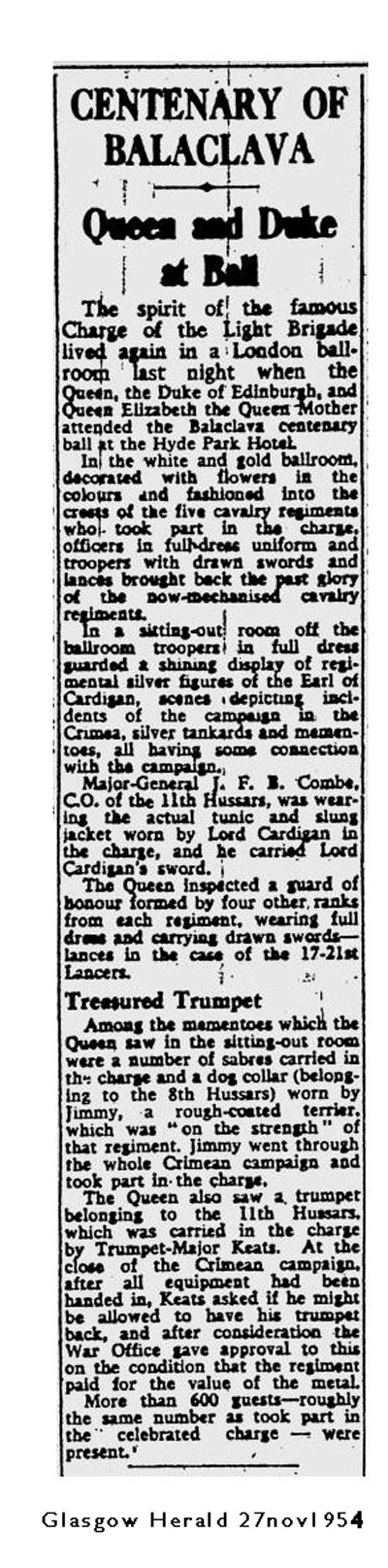 "Among the momentoes which the Queen saw in the sitting-out room were a number of sabres carried in the charge and a dog collar (belonging to the 8th Hussars) worn by Jimmy, a rough-coated terrier which was on the strength of that regiment."